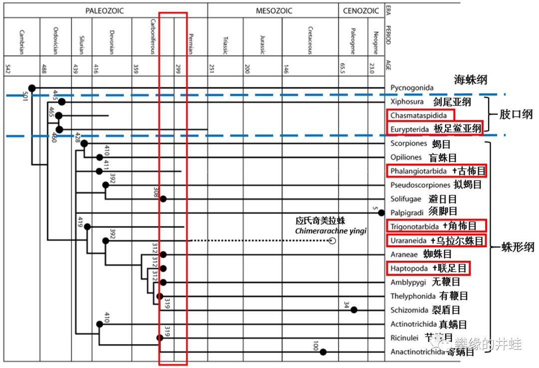 螯肢类主要类群的生存年代。角怖目和古怖目占古生代蛛形纲种类的80%,它们在二叠纪初在消失。在蜘蛛崛起之前,蛛形类乃至螯肢类还要在低谷中徘徊很久。图片来源自[16]。