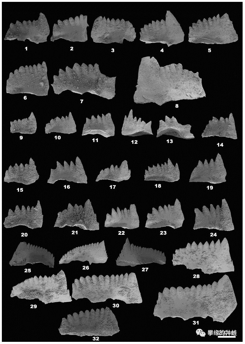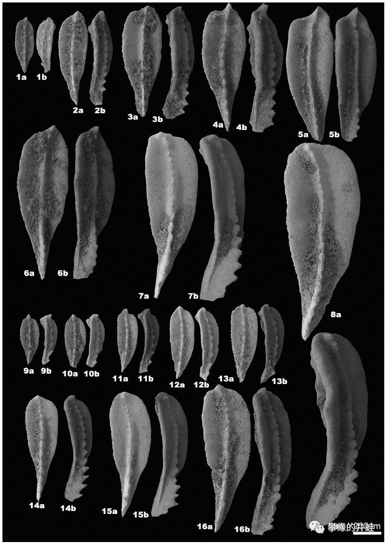 重庆中梁山凉风垭PTB附近的牙形刺。牙形动物(参见第八十九回碎骨狂魔)就是用这些牙齿碾碎像介形类和䗴类的小生物。图片来源自[12]。