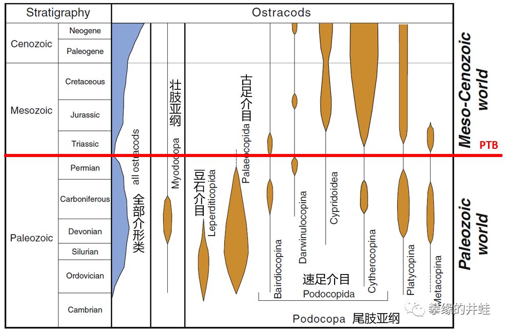 介形类自奥陶纪出现(参见第八十一回芥豆),种类基本保持平稳。唯独在二叠纪末出现一次锐减。古足介目灭绝,速足介目兴起。这个微小的甲壳动物家族,也悄然完成了一场王朝更替。图片来源自[11]。