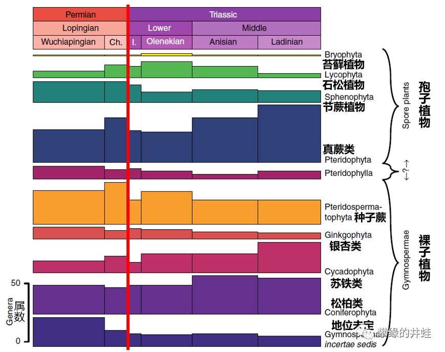 二叠纪晚期到三叠纪陆生植物多样性统计,并没有出现低谷和断层。石松类的衰减,被真蕨类和裸子植物的发展填补,好像只是普通的演替。在二叠纪末的一片哀鸿中,显得非常特别。图片来源自[17]。