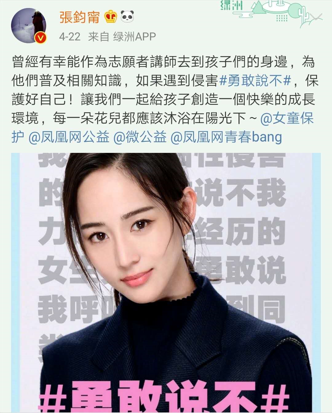 张钧甯是女童保护爱心大使,也是该项目的第一位明星志愿者讲师。去年,通过讲师考核的她走进山区,给孩子们上了一堂防性侵课程。她对公益的态度是:“献出一份爱心,帮助孩子走向美好的未来。点滴公益爱心,方能成大爱。”这一次,她也和所有未成年人站在一起,鼓励他们勇敢说“不”。