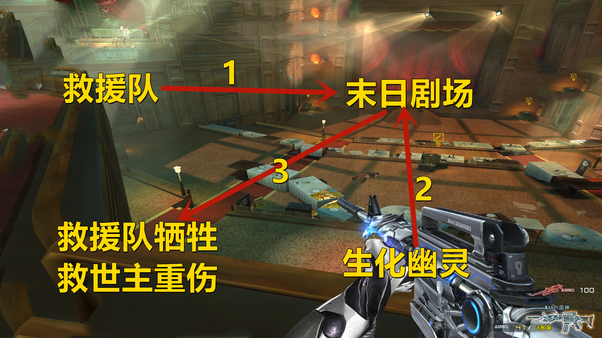 如果结合上述我的分析,我就可以得出来救世主在这里的行动了,很有可能是这样的,救世主带领着救援队因为歌声来到了这个剧场里面,却没想到这个剧场藏着大量的感染体,他也没想到会是这样的局面,众人很快便被这些生化幽灵给感染了,只有救世主在高处苦撑着,可没想到生化幽灵还是将他抓伤了。