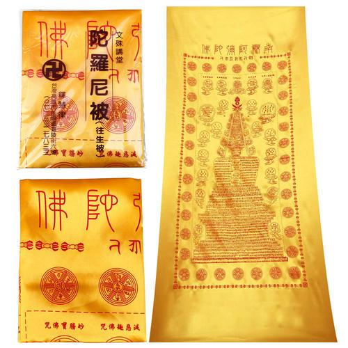 往生被又名‘陀罗尼被’。其来源非出自《大藏经》,而系明季密宗盛行,金刚上师为慈悲救世故,集诸佛密咒,以梵文(或藏文)书于布帛,犹似坛场、《藏经》,倘经加持,其效力更不可思议。将此被覆盖亡者遗体,能令其消业灭罪,阴间众生见之为一片光明,可免亡者遭宿世冤家、魔障损恼。此物虽极珍贵,然当时市井并无流通,李炳南老居士曾言:‘(此被)或由藏地传入,但知于前清时代,二品以上王公大臣命终之后,由朝廷敕赐,而普通官民不得擅用,今则无禁矣!’
