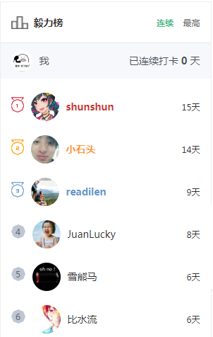 我们新增【毅力榜】,为坚持不懈的你加油呐喊: