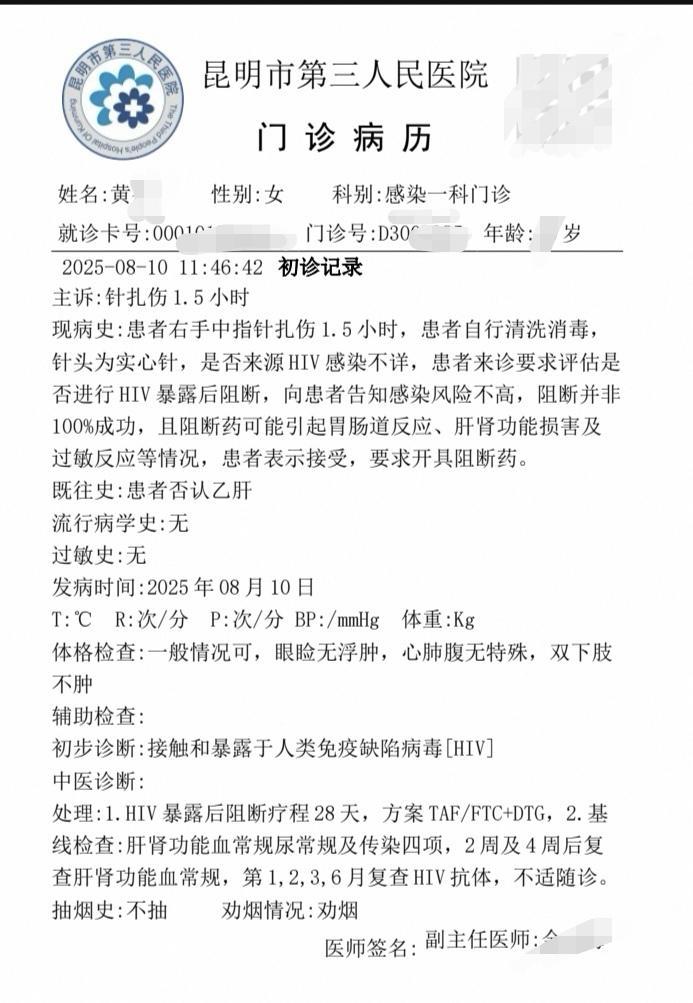 很快,黄女士找到了酒店工作人员。“他们的工作人员过来试图将针拔下来时,也被扎了,最后费了很大功夫才取出来。”黄女士告诉红星新闻记者,随后酒店的人带她去了医院检查,由于担心感染HIV病毒,她要求医生开了阻断药并服用。