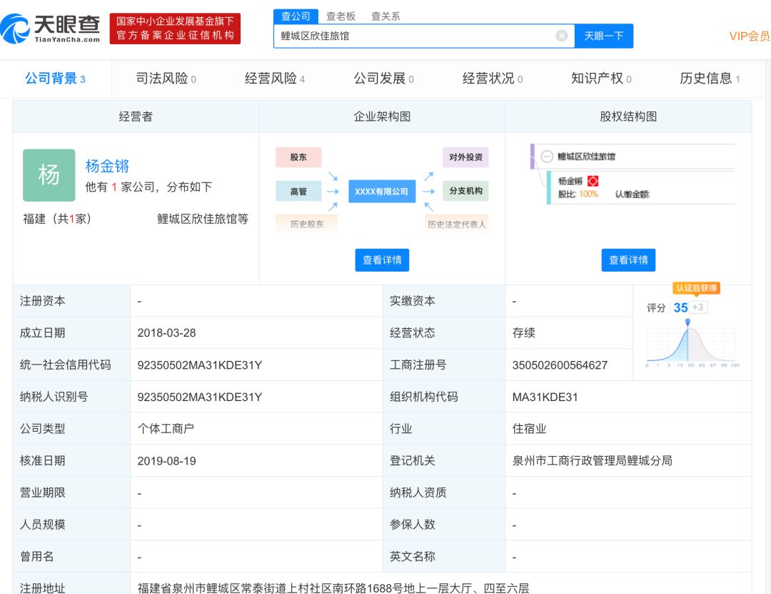 天眼查数据显示,鲤城区欣佳旅馆位于鲤城区南环路1688号中骏四季康城一期旁,2018年3月成立,2018年6月开业。法定代表人名为杨金锵,其名下仅有欣佳旅馆一家企业。