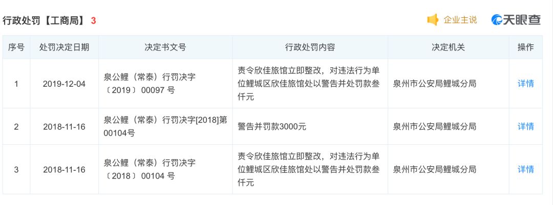 然而天眼查数据显示,其注册地址为福建省泉州市鲤城区常泰街道上村社区南环路1688号地上一层大厅、四至六层。 在2018年11月至2019年12月的一年多时间中,欣佳旅馆曾3次被泉州市公安局鲤城分局处以行政处罚。被处罚原因均为未按规定办理住宿登记。