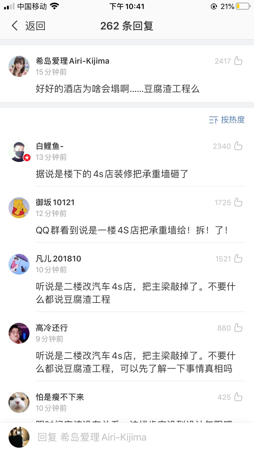 微博有网友爆料称,垮塌原因或许是楼下4s店装修将大楼承重墙拆除,导致整栋大楼垮塌。