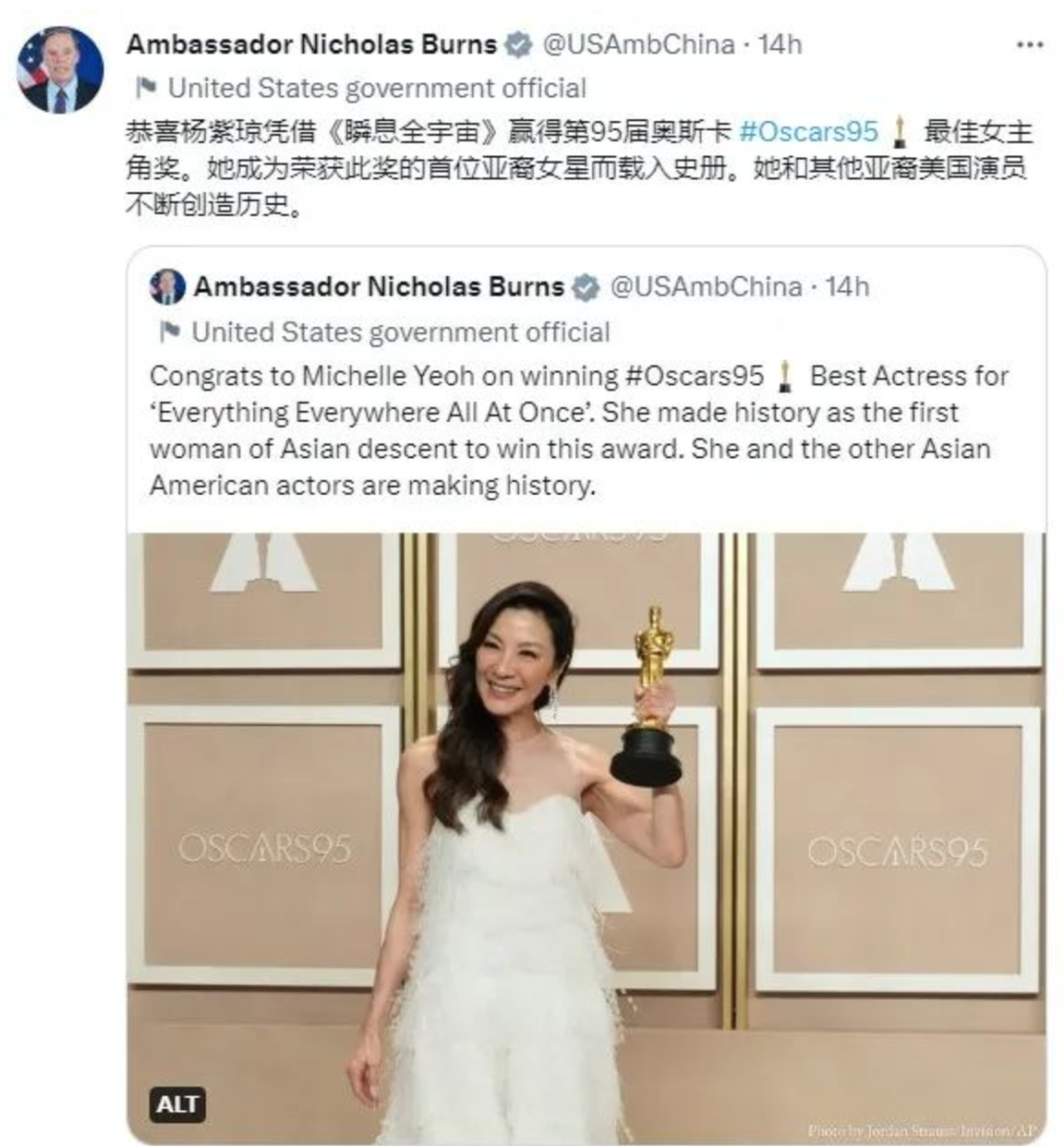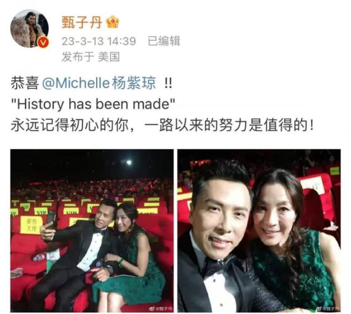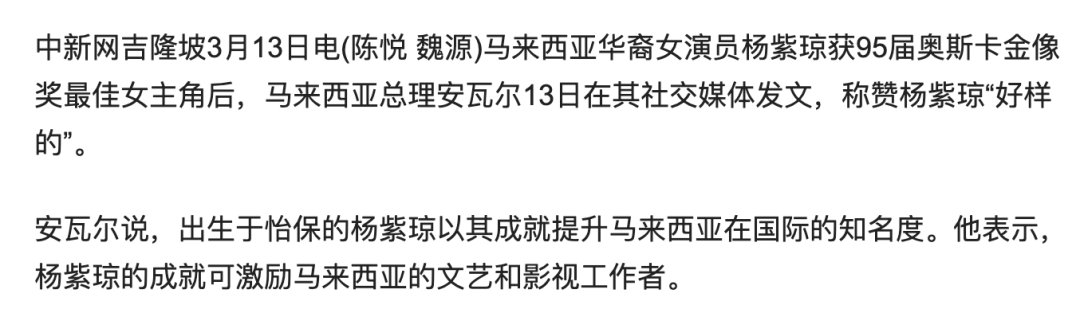 北京时间3月13日,第95届奥斯卡颁奖典礼举行,华裔女星杨紫琼凭借《瞬息全宇宙》获得影后,成为奥斯卡历史上首位亚洲影后。