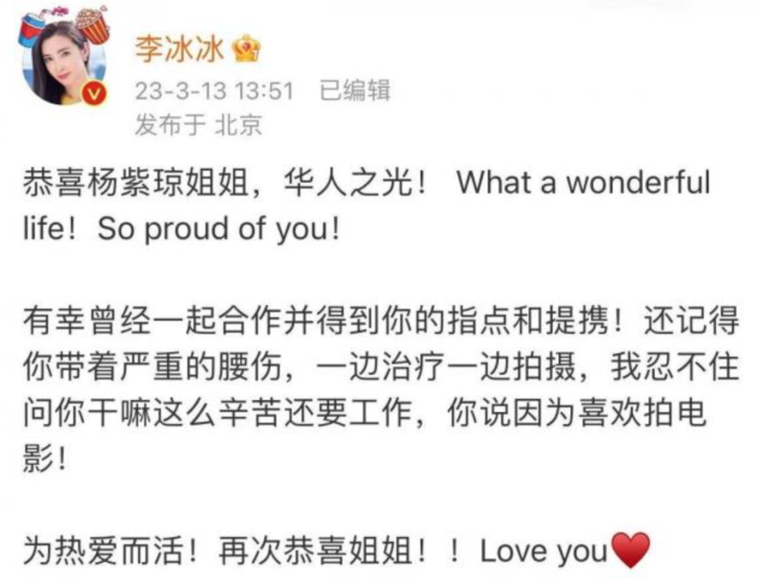 内地名人有和杨紫琼合作过《天鹰》的李冰冰: