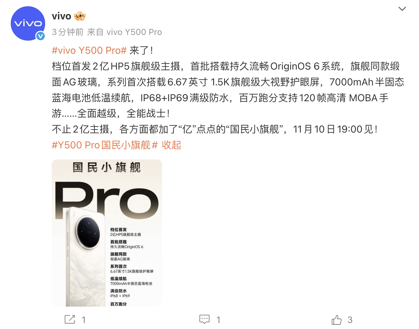 凤凰网科技讯 11月4日,vivo官方宣布,“国民小旗舰”vivo Y500 Pro 11月10日19:00发布。新机将首发2亿HP5旗舰级主摄,首批搭载OriginOS 6系统,旗舰同款缎面AG玻璃,系列首次搭载6.67英寸1.5K旗舰级大视野护眼屏,7000mAh半固态蓝海电池以及IP68+IP69满级防水。