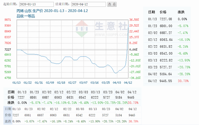 4月11日,也就是上周六,丙烯市场出现了普遍1000元/吨以上的上调,4月12日,山东地区丙烯市场价格单日宣涨普遍超1000元/吨,涨幅达35.02%,部分企业更是暴涨5000元/吨,涨幅已近100%,市场成交已飙升至8000-12000元/吨,部分厂家暂停报价。