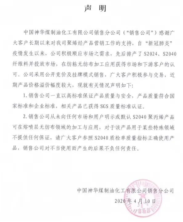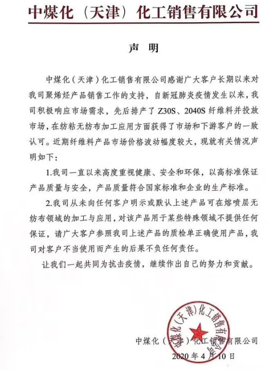 “4月10日,包括中国神华煤制油化工有限公司销售分公司、中煤化(天津)化工销售有限公司等均发布《声明》,对其公司产销的两个牌号的纤维料的用途做了说明,并对其提及产品被用于特殊领域不做保证、不承担责任,号召广大客户正确使用产品,共同为抗击疫情继续做出自己的努力和贡献。”满蓉蓉告诉证券时报•e公司记者,由于口罩生产过程中用料乱象,多家上游企业已相继发声。