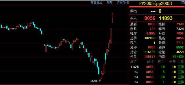 4月13日早间,国内期货市场上聚丙烯主力合约2009再度强势上行,截至上午收盘报7224元/吨,涨幅5.92%。而此前在4月10日,聚丙烯主力09合约开盘6650点,最高7007点,收盘6983点,日涨240点,涨幅3.56%;而05合约则大涨732点,当日涨停,涨幅高达10%。