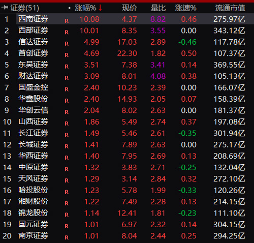 个股方面,西南证券、西部证券携手涨停,信达证券大涨4.99%,首创证券涨超4%,财达证券、山西证券、长江证券等也纷纷上扬。