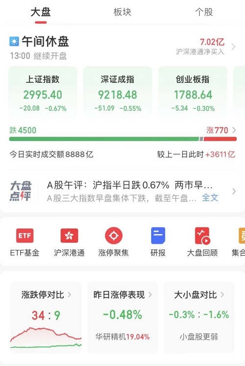 上午A股震荡,主要指数也由涨转跌。上午收盘,上证指数跌0.67%,失守3000点,深证成指跌0.55%,创业板跌0.3%,科创50受半导体板块拖累跌1%。个股跌多涨少,4500只下跌,770只上涨,成交额为8888亿元。