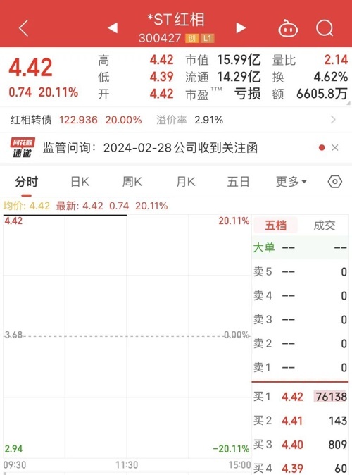 在行政处罚相关公告发布后,*ST红相和对应的转债红相转债,开盘直接20%涨停,盘中虽然略有打开,但随后仍然封住涨停直至上午收盘。