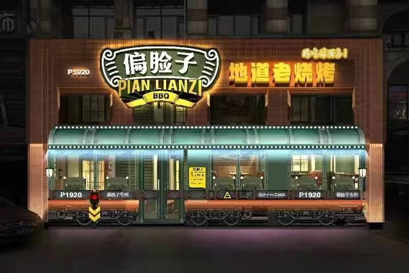 偏脸子烧烤用现代时尚的手法营造街巷的感觉,融合哈尔滨地方文化与铁路文化,营造独特餐厅氛围。以砖红色、哈尔滨绿为主色,以金属色、咖色为配色。