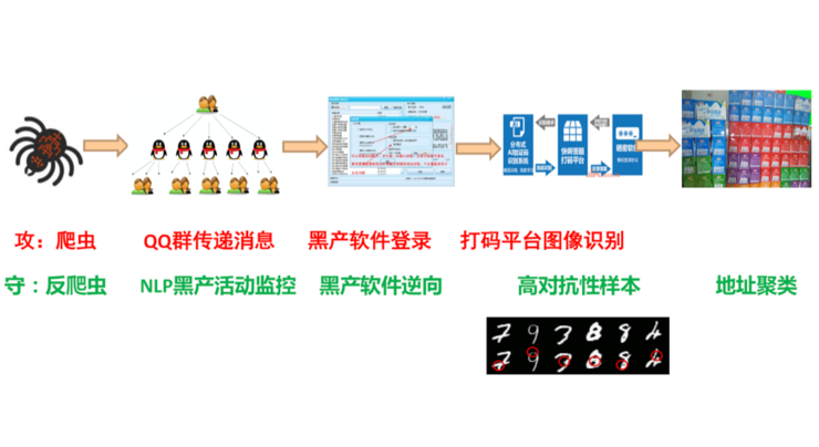 第二步,我们会渗透到大量黑产群里,用我们自己的爬虫爬取信息,比如,会用NLP的技术监控黑产的活动,黑产所用到的工具、技术等。