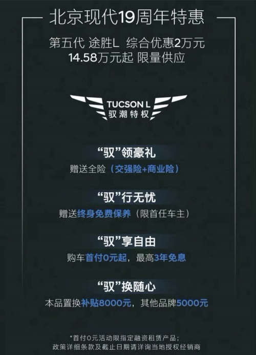 然而加价卖车这件事,在第五代途胜L这里是绝不存在的;而且不仅不加价,现在又临近年底的购车旺季,北京现代还特别推出了十九周年特惠政策,为用户送上2万元的综合优惠,至低14.58万元就入手新车,并为用户提供全险(交强险+商业险)支持、购车首付0元起、至高3年免息、终身免费基础保养(限首任车主)、至高8000元置换补贴等优惠政策,在解决用户购车价格焦虑的同时,更极大程度解决用户的用车以及养车的难点。