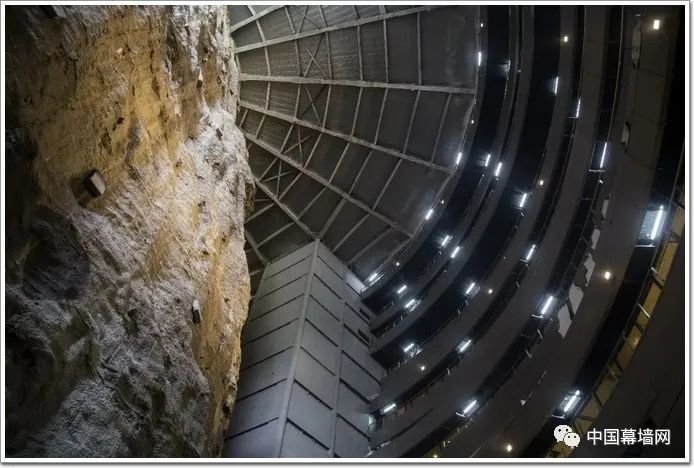 上海深坑酒店项目主体由中建八局总承包公司承建,幕墙工程由苏州金螳螂打造,配套材料包括:兴发铝材、陶熙胶、晶博特玻璃,以及坚朗五金等。主体建筑位于废弃深坑内,依崖壁建造,总建筑面积55058平方米。酒店主体建筑分为坑上、坑下及水下三大部分。总建筑高度约为74米,其中地上建筑2层(局部带1层地下室),高度约10米;地下至水面建筑共14层,高度约53.6米;水下部分建筑2层,高度约10.4米。