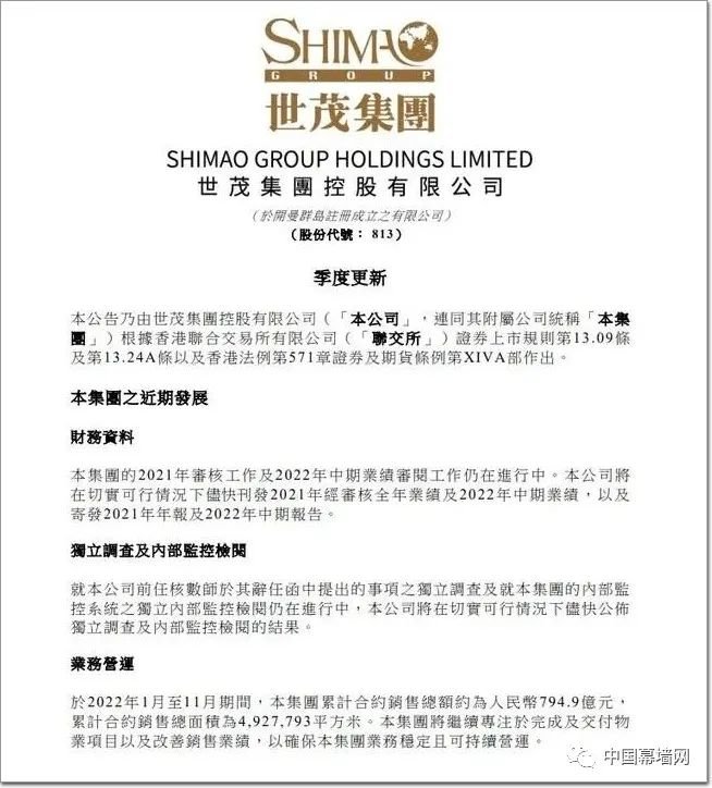 2023年1月3日晚间,世茂集团在港交所公告称,2022年1月至11月期间,集团累计合约销售总额约为人民币794.9亿元,累计合约销售总面积为4927793平方米。公司正与其财务及法律顾问积极推进境外债务重组工作,并持续与各类债权人进行建设性对话,包括但不限于由该公司发行以美元计值的优先票据的持有人、境外银行贷款人及其各自的顾问。过去数月,各方在制定重组框架和收窄各项经济条款的分歧方面取得重大进展,公司将在切实可行情况下尽快发布境外债务重组计划。