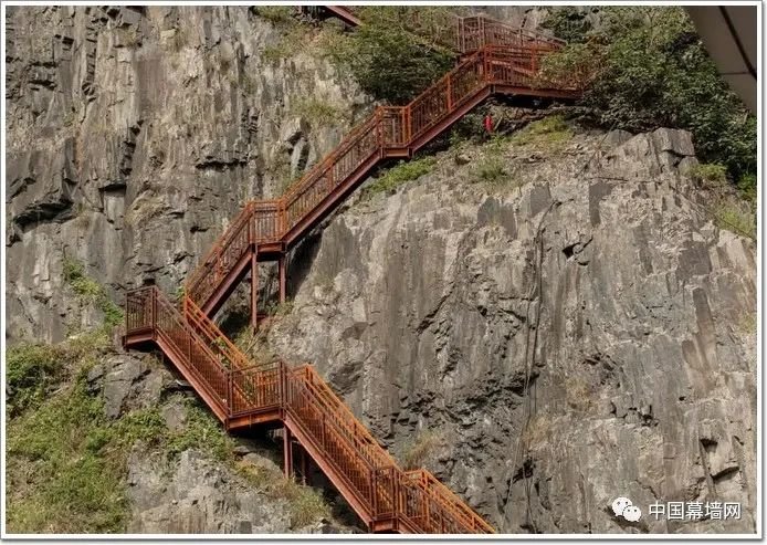 工程主要幕墙系统包括:框架玻璃幕墙,点式玻璃幕墙、玻璃肋幕墙、金属幕墙、金属格栅、玻璃栏杆、玻璃门、玻璃雨篷。主楼使用玻璃幕墙和金属板材,曲线的立面形式源于“瀑布”。所有酒店客房都设置退台的走廊和阳台作为“空中花园”,可以近距离观赏对面百米飞瀑和横山景致。