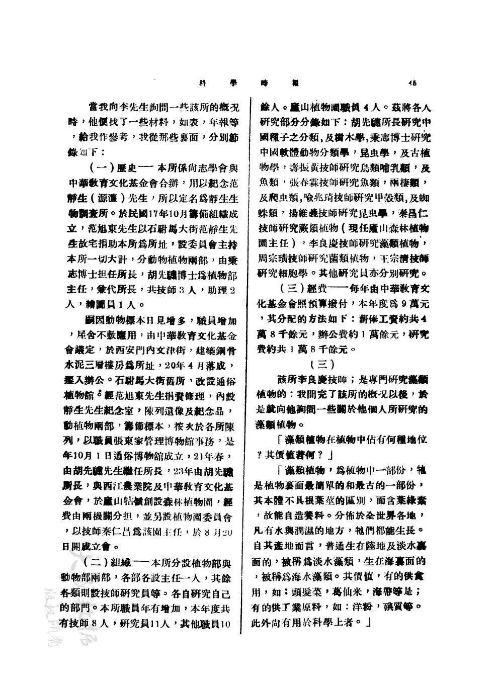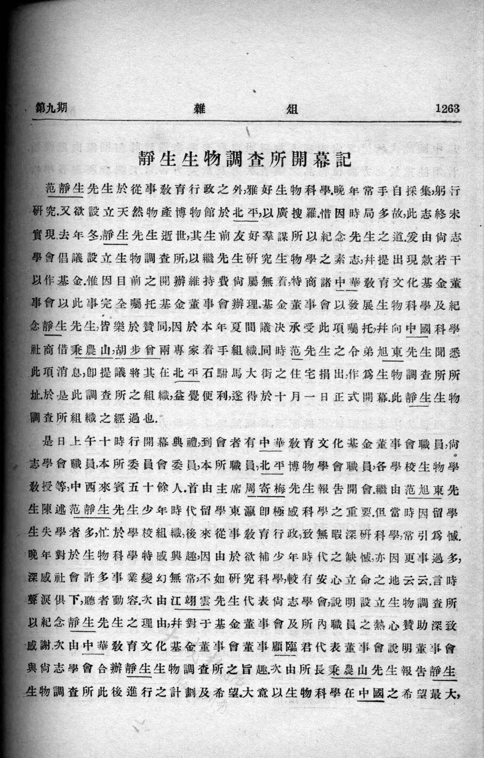 据中国科学院植物研究所介绍:1927年9月,中国科学社生物学研究所邹秉文、胡先骕、秉志联名致函中华文化教育基金会董事会干事长范源濂,建议中基会在北京设立生物调查所。获得了范源濂的同意。岂料,12月范源濂病逝了。