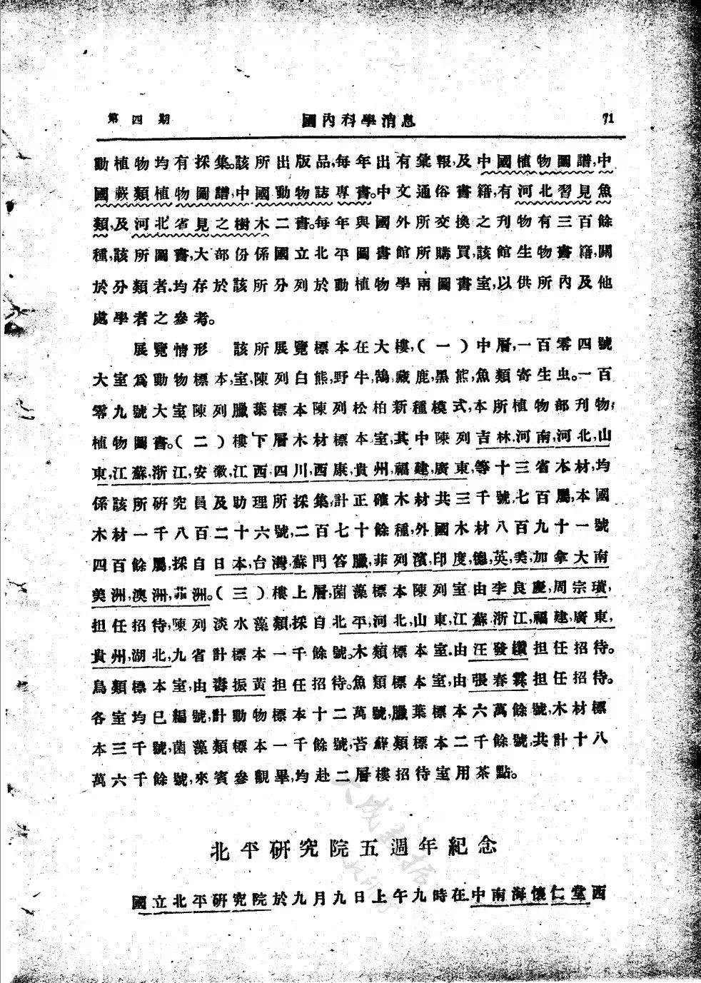 10月1日,静生生物调查所成立典礼在石驸马大街83号举行。中基会董事会职员、尚志学会职员、静生所委员会委员、该所职员、北平博物会职员、各学校生物教授等中外宾客50余人出席。静生所设动物部和植物部,分别由秉志、胡先骕任主任。植物部成员有唐进、汪发缵、李建藩、冯澄如、张东寅等。