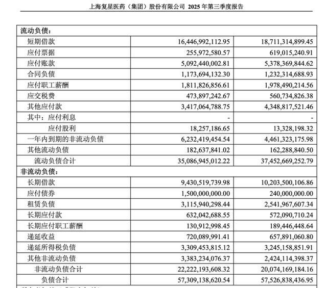 从债务结构来看,截至2025年9月30日,复星医药短期借款达164.47亿元,长期借款达94.31亿元,且一年内到期非流动负债为62.32亿元,与此同时,复星医药货币资金只有114.78亿元。