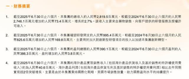 2021年复宏汉霖成功摘“B”,此后业绩持续向好。财报显示,2025年上半年其营收28.20亿元,同比增2.7%,收入主要来自药物销售、研发服务及授权许可收入。净利润3.9亿元,经营性现金流超7.71亿元,同比大增206.8%。创新药H药“汉斯状”已在欧盟、新加坡等近40个国家和地区获批上市,此外,海外产品表现亮眼,实现销售收入约0.41亿元(含供货及特许权使用费收入),海外利润(含供货毛利及特许权使用费利润)较去年同期实现超2倍增长,主要得益于国际化战略推进下美国市场的销售放量,助力国际盈利水平持续提升。