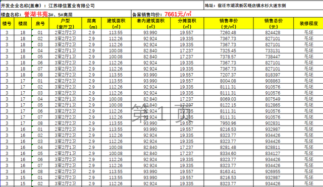 誉湖书院3#、5#高层 毛坯房 备案量共计360套房源,建筑面积约为97—114㎡,销售均价7661元/㎡。