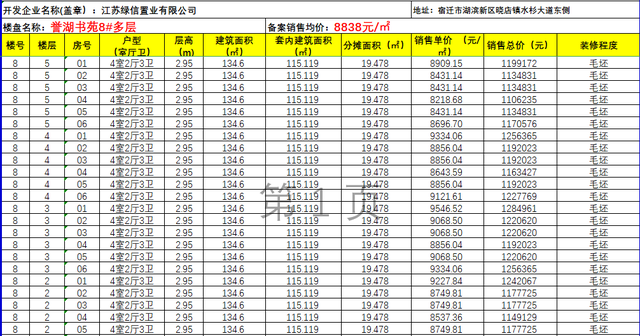 誉湖书院8#多层 毛坯房 备案量共计30套房源,建筑面积约为134㎡,销售均价8838元/㎡。
