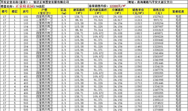 正荣府花园17#高层 毛坯房 备案量共计162套房源,建筑面积约为88—138㎡,销售均价12300元/㎡。