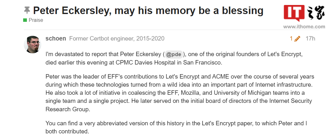 昨日,Let's Encrypt 的创始人之一 Peter Eckersley 在旧金山的 CPMC Davies 医院去世。