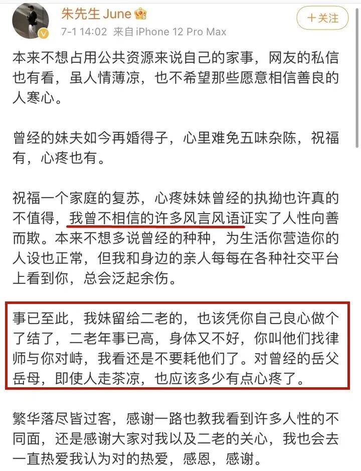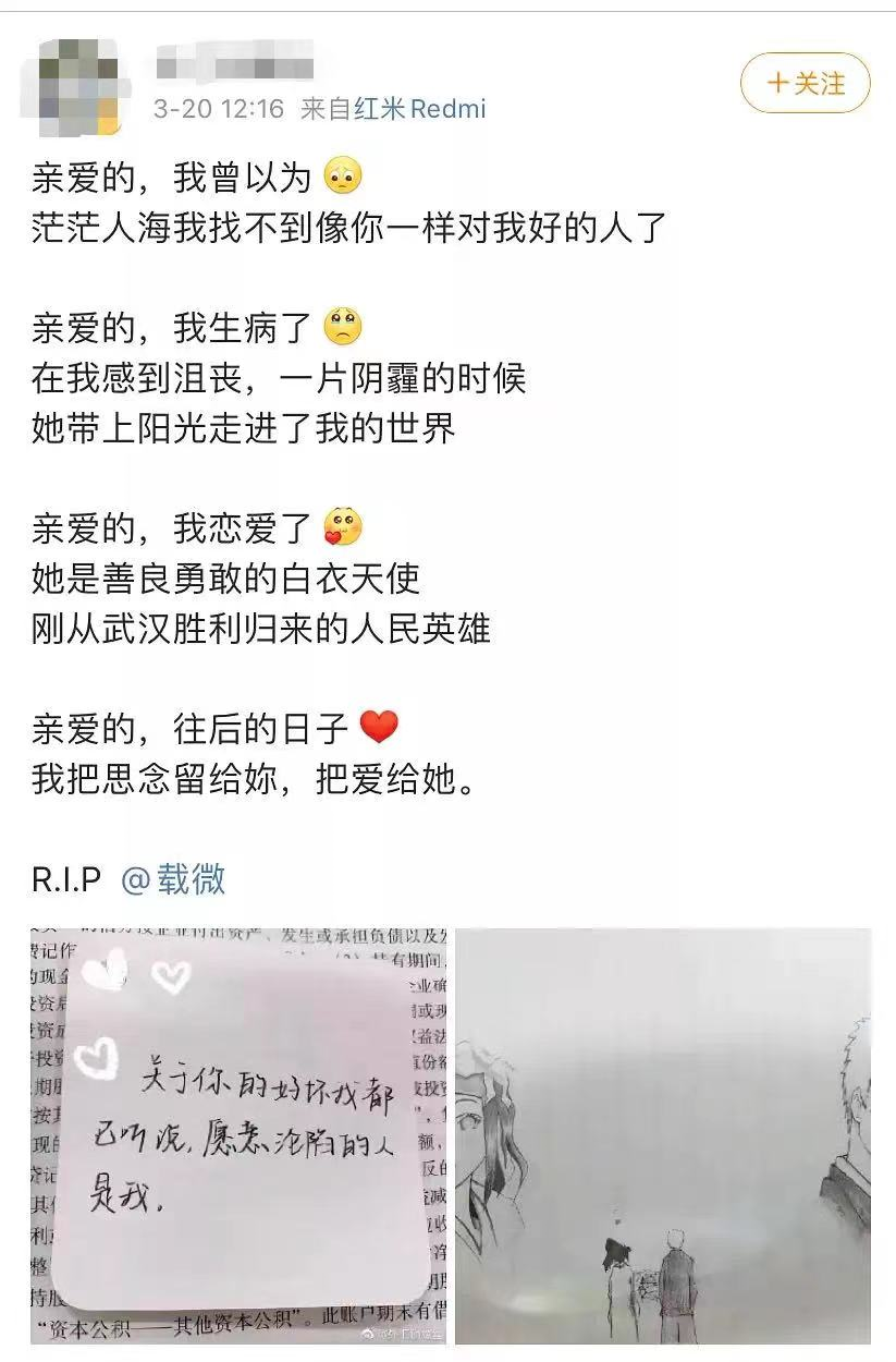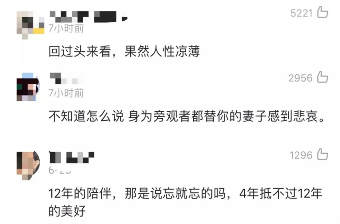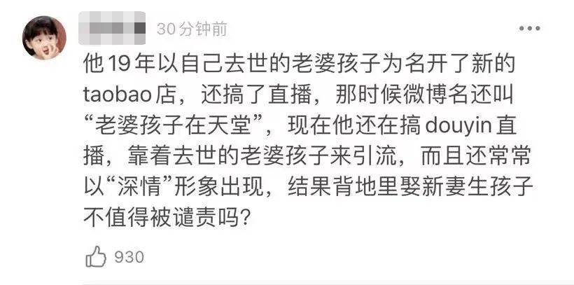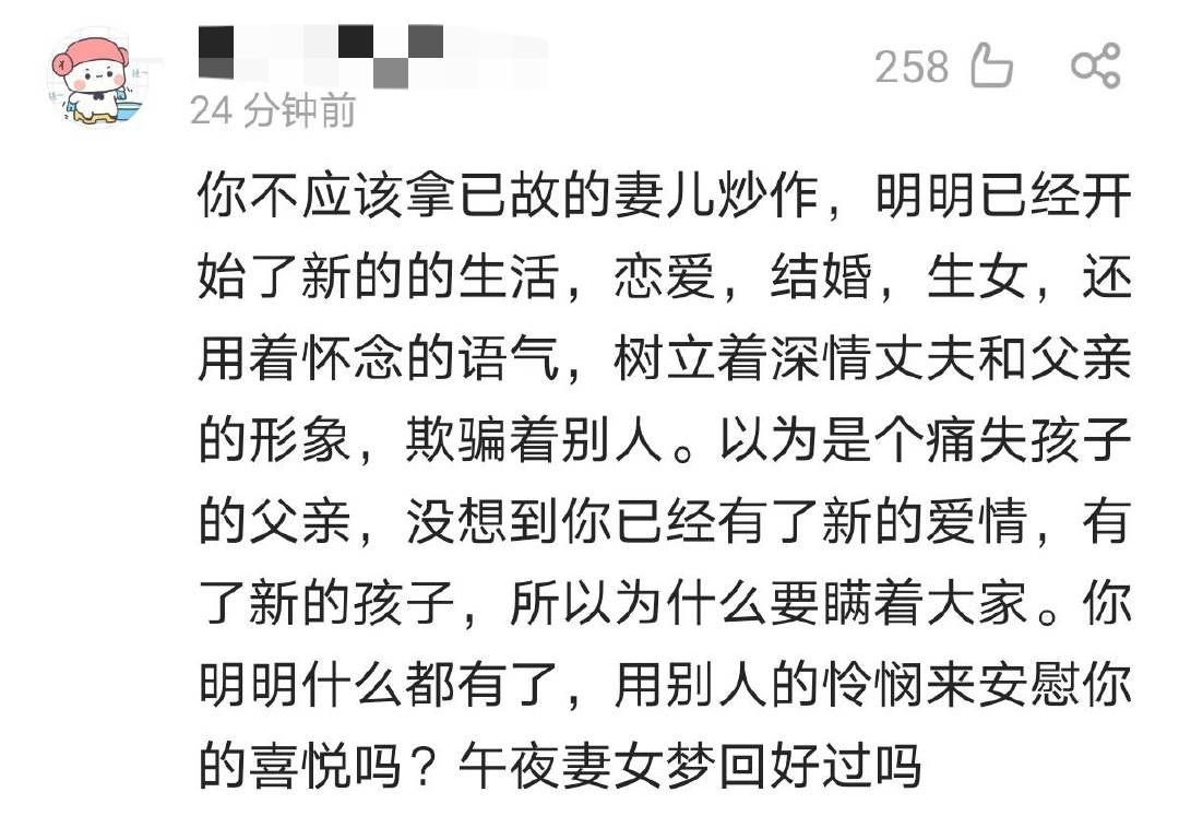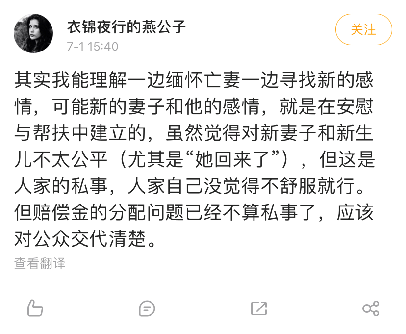关于他一边悼念亡妻,一边拥有新的生活引发的争议,就像博主 @衣锦夜行的燕公子 的观点那样:可能新妻子和他的感情就是在安慰和帮扶中建立的。