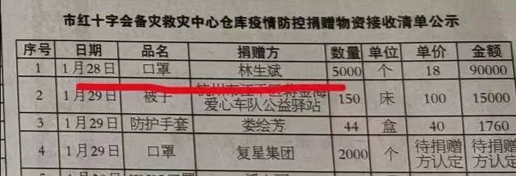 最让人动容的一次,是在疫情期间,有人无意点开了杭州红十字会的明细,赫然发现林生斌以个人名义,捐赠了5000个口罩,价值9万元。