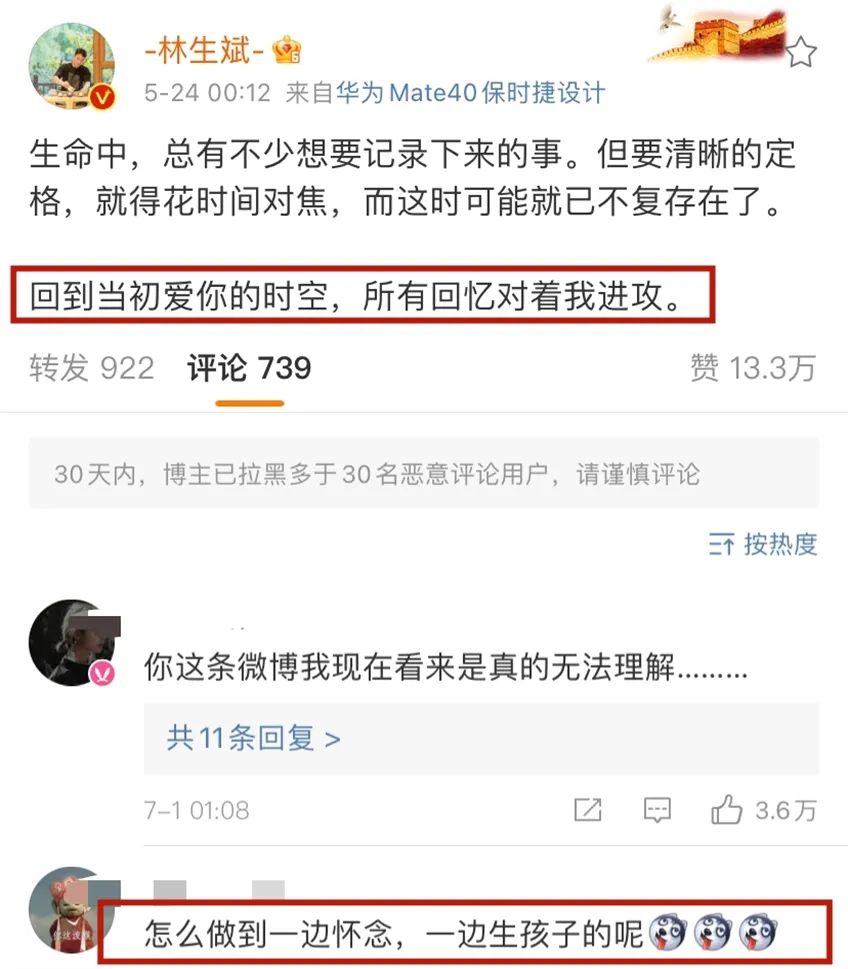 甚至在5月24号,也就是孩子刚出生没几天时,林生斌的微博还在隔空向亡妻表达爱意。