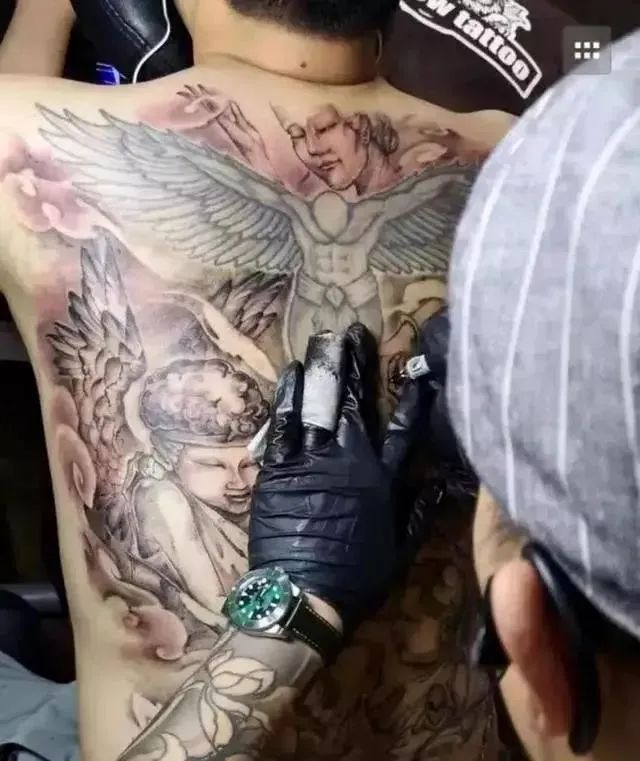 悲痛中的他,还把老婆孩子以天使的形象刻在了自己的背上。