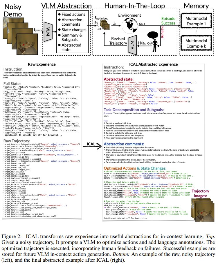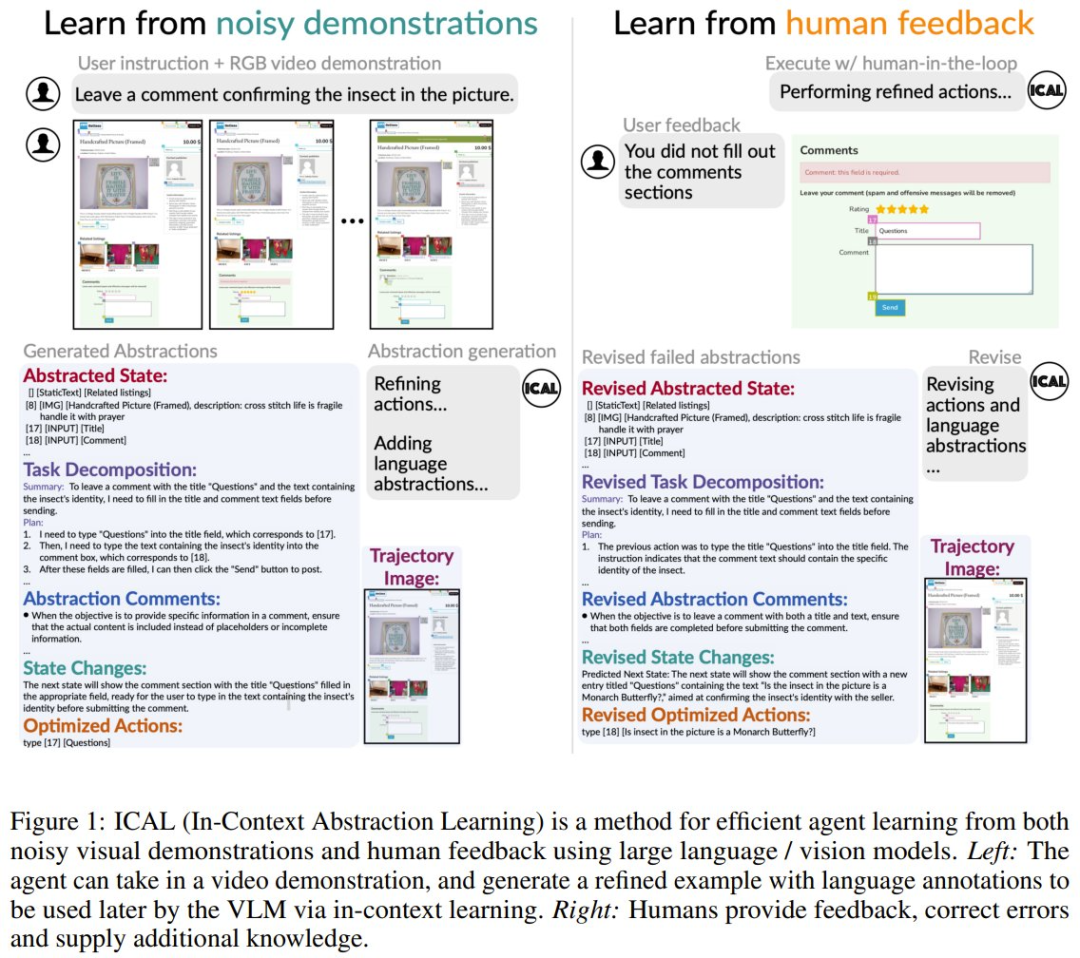 当具有最优或次优演示时,ICAL 可通过提示 VLM 将这些演示转换为优化后的轨迹,同时创建相关的语言和视觉抽象。然后在人类的自然语言反馈的引导下,通过在环境中执行这些轨迹来优化这些抽象。
