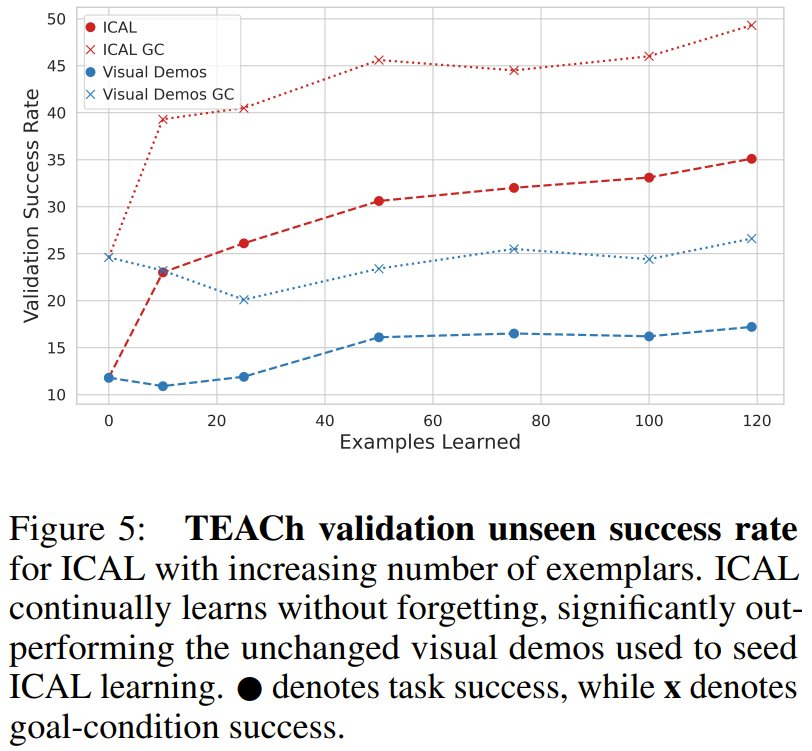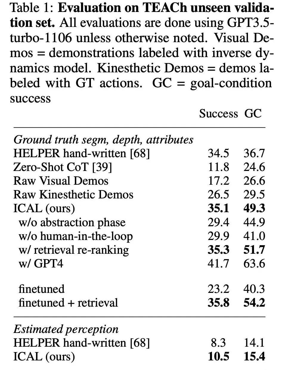 如表 1 所示,在未见过的任务上,ICAL 的表现优于作为上下文示例的未被处理的演示,其成功率比带有预测动作的原始演示提高了 17.9%,比带有真实动作注释的演示提高了 8.6%。这凸显了新提出的抽象方法在提高样本质量以改进上下文学习方面的有效性,这不同于之前的主要方法,即保存和检索成功的行动规划或轨迹但不进行抽象。