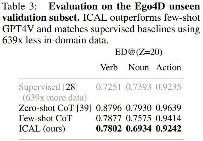 在 Ego4D 设置中,ICAL 的表现优于使用思维链的少样本 GPT4V,分别将名词和动作编辑距离缩短了 6.4 和 1.7,并且与完全监督式方法相差无几 —— 但使用的领域内训练数据减少了 639 倍。