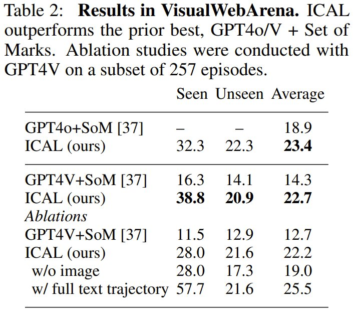 另外,在视觉网络任务上,ICAL 也获得了 SOTA 性能。在 VisualWebArena 上,新智能体超过了 GPT4 + Set of Marks 的组合,使用 GPT4V 时从 14.3% 提高到 22.7%,使用 GPT4o 时从 18.9% 提高到 23.4%。