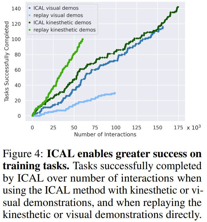 如图 4 所示,与模仿原始轨迹相比,ICAL 对有噪声的轨迹进行了修正,使训练任务的成功率更高,动觉演示和视觉演示的成功率分别提高了 42% 和 86%。这表明 ICAL 不仅增加了有用的抽象概念,还纠正了被动视频演示中的错误,提高了在原始演示环境中的成功率。
