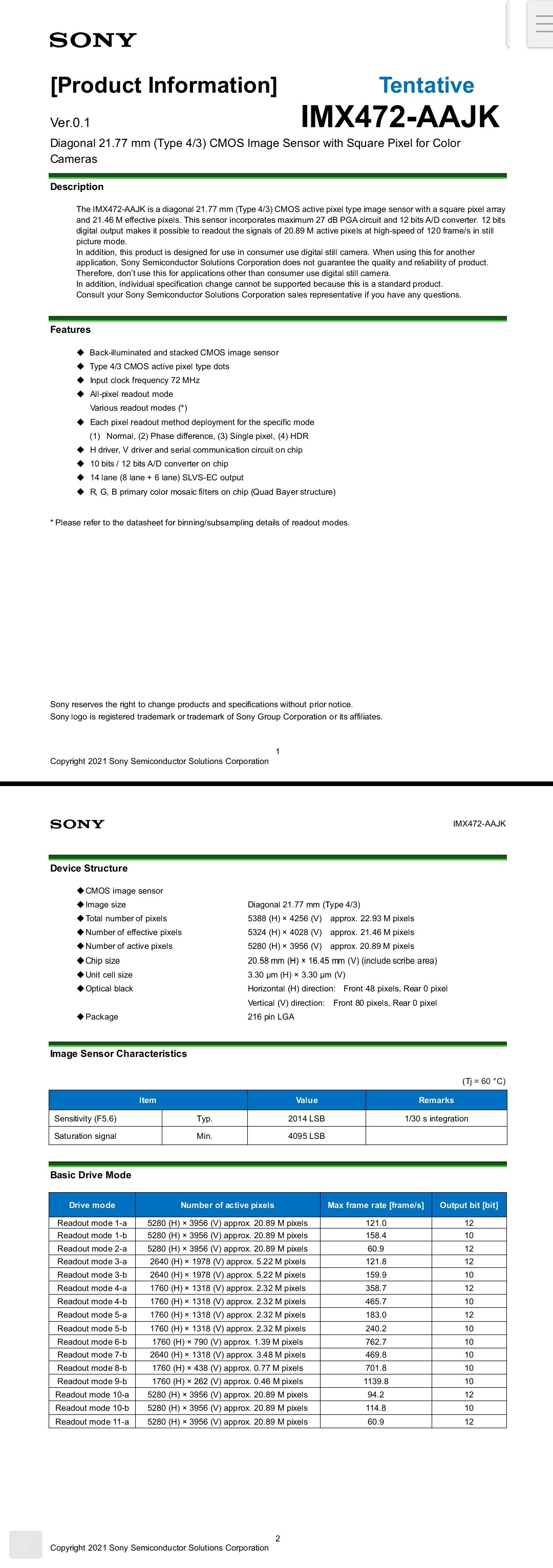 IMX472-AAJK 是一颗 20MP 的 Exmor RS 传感器,M4/3 规格,输出速度高达 20Mp 12Bit 120fps,像素尺寸是 3.3μm,采用 QuadBayer 结构。