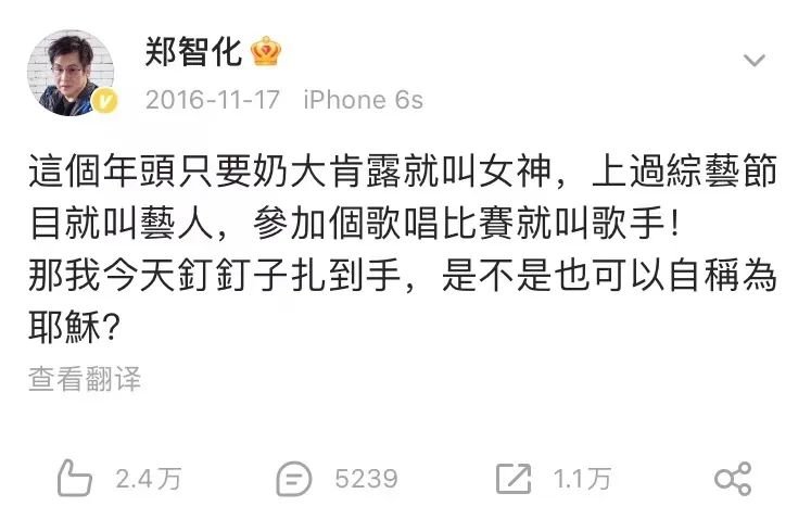 2016年,他痛批娱乐圈:“这个年头只要奶大肯露就叫女神,上个综艺就叫艺人,参加个歌唱比赛就叫歌手!那我今天钉钉子扎到手,是不是也可以自称为耶稣?”。