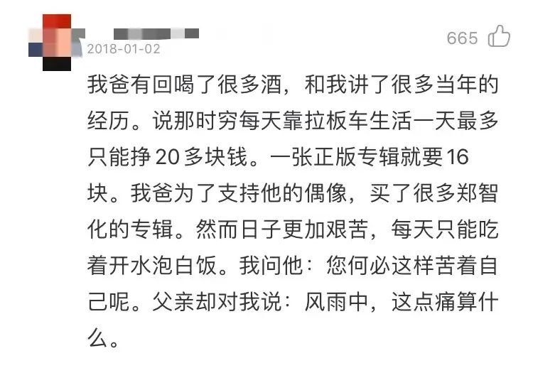 父亲年轻时很穷,每天靠拉板车生活,一天最多只能挣20多块钱。不过,就算薪水如此微薄,父亲也会花钱买郑智化的专辑。最困难的时候,只能靠开水泡饭度日。