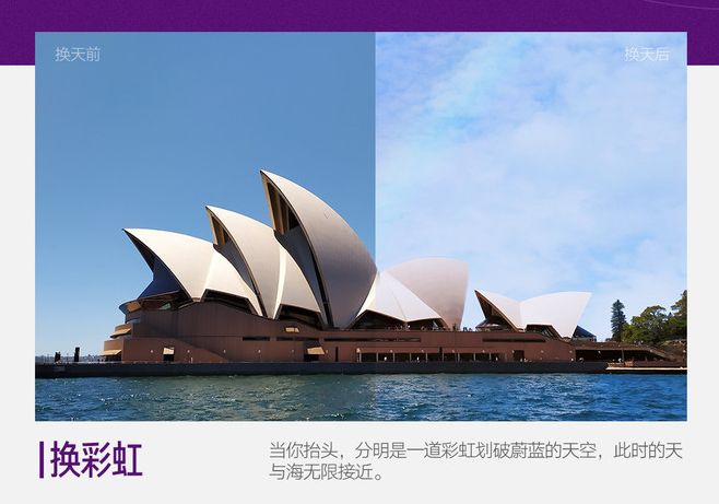 用户可通过该功能对照片中的天空进行优化,比如说变换成晴天、多云、彩虹等多种效果。