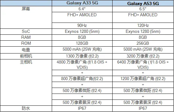 三星Galaxy A33 5G及Galaxy A53 5G规格均会配备5nm 的Exynos 1280,两机都内置5000 mAh电量,支持25W快速充电功能,更提供4代One UI 更新及5年系统安全更新。