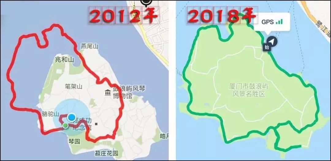 卓越兄时不时来鼓浪屿闭环走七公里,你看看微博时代的GPS画轨迹与微信时代的,如此大相径庭。